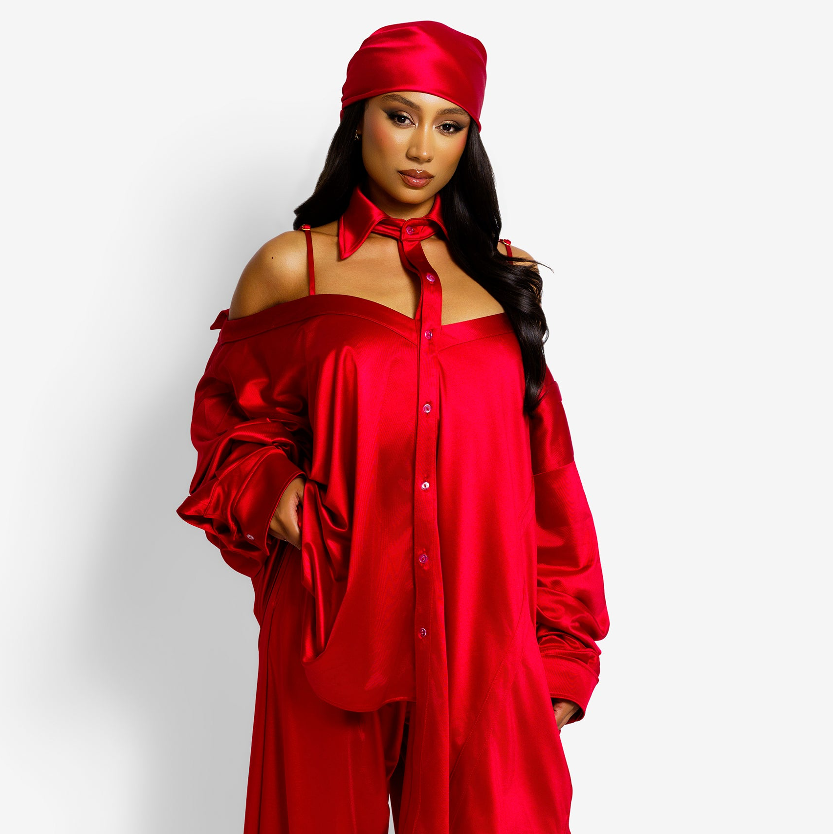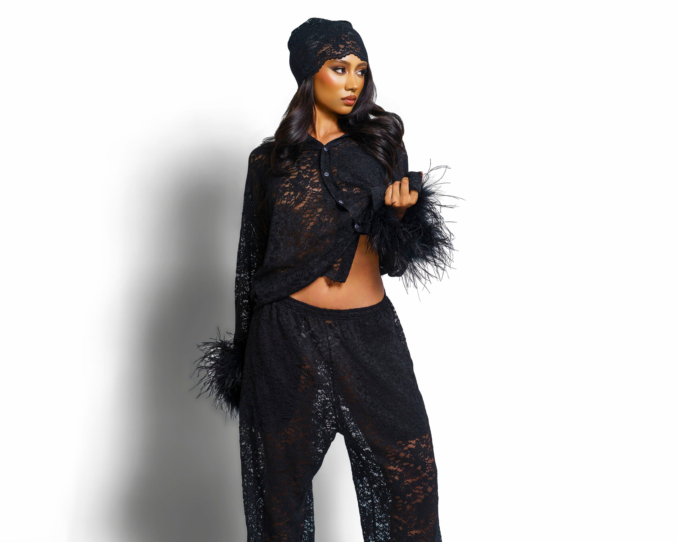 Slip into our new arrivals in black and red satin, sheer lace, and feathered details, finished with matching headwraps that turn every holiday entrance into a moment.